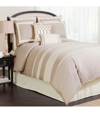 Soft and calming, this comforter set is perfect for helping to create a room where you can really relax. It has the Hotel look of quality but the warmth you really want in your own personal space. Features: -Set includes: One comforter, one bed skirt, two euro shams, two pillow shams and two decorative pillows. -Color: Beige. -Fabric content: 100% Polyester. -250 GSM comforter. -Dry clean. -Pillows: Hand wash. Dimensions: -Queen: 92" H x 90" W, 15 lbs. -King: 92" H x 104" W, 16 lbs. -California King: 92" H x 104" W, 16 lbs.