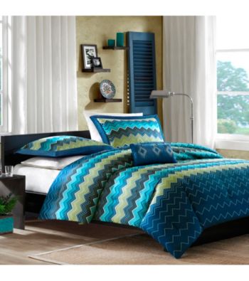 For a modern look and a pop of color, the Emma comforter set is perfect for any bedroom. Its medium blue background is paired with teal, green and navy in a zig pattern that gives this set a fun and youthful appeal. Set includes: 1 comforter, 1 sham for twin-size option, 2 shams for full/queen-size option Style: Contemporary Fabric detail: Printed Pattern: Natural Color options: Blue, purple Comforter/sham face materials: 100-percent polyester micro fiber Comforter/sham back material: Micro fiber Comforter filling material: Poly fill Pillow material: Poly cover and poly fill Care instructions: Machine wash Twin TXL Dimensions Comforter: 66 inches wide x 90 inches long Sham: 20 inches wide x 26 inches long Pillow: 10 inches wide x 18 inches long Full/Queen Dimensions Comforter: 86 inches wide x 90 inches long Sham: 20 inches wide x 26 inches long Pillow: 10 inches wide x 18 inches long The digital images we display have the most accurate color possible. However, due to differences in computer monitors, we cannot be responsible for variations in color between the actual product and your screen.