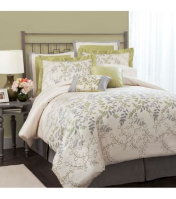 This soft and stylish comforter set features a comforter, bedskirt, Euro shams, pillow shams and decorative pillows to customize the bed with. The cheery green-tinged contemporary set is suitable for all seasons. Set includes: Comforter, bedskirt, two Euro shams, two pillow shams, two decorative pillows Style: Contemporary Fabric detail: Woven Color: Green Bedskirt drop length: 14.5 inches Materials: Polyester Fill material: Polyester Comforter/ bedskirt/ shams care instructions: Dry clean Pillows: Spot clean Warmth rating: All-season Queen Dimensions Comforter: 90 inches wide x 92 inches long Shams: 20 inches wide x 26 inches long Bedskirt: 60 inches x 80 inches with a 14.5-inch drop Euro shams: 26 inches x 26 inches Decorative pillow: 16 inches x 16 inches Decorative pillow: 18 inches x 12 inches King Dimensions Comforter: 104 inches wide x 92 inches long Shams: 20 inches wide x 36 inches long Bedskirt: 78 inches x 80 inches with a 14.5-inch drop Euro shams: 26 inches x 26 inches Decorative pillow: 16 inches x 16 inches Decorative pillow: 18 inches x 12 inches California King Dimensions Comforter: 104 inches wide x 92 inches long Shams: 20 inches wide x 36 inches long Bedskirt: 72 inches x 84 inches with a 14.5-inch drop Euro shams: 26 inches x 26 inches Decorative pillow: 16 inches x 16 inches Decorative pillow: 18 inches x 12 inches The digital images we display have the most accurate color possible. However, due to differences in computer monitors, we cannot be responsible for variations in color between the actual product and your screen.