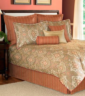 Bedding. Web exclusive! Add beauty and elegance to your bedroom with the Zanzibar bedding collection from American Century Home. Infuse your bedroom with the delightful colorings found in this American Century Home bedding collection. Taking a cue from Zanzibar's trade industry, your eyes will be treated to hues found in the region's spices: cloves, cinnamon and nutmeg, all resting against a traditional creamy ground. The euro sham and two of the three decorative pillows vary up the collection with an elegantly contrasting stripe design. Available in Queen and King sizes Queen: 92x96" comforter; bed skirt with a 15" drop King: 110x96" comforter; bed skirt with a 15" drop Comforter set includes comforter, bed skirt and two shams (King has King shams) 180-thread count cotton comforter with 7.5-oz. polyester fill and jump & tack quilting 180-thread count cotton pillow shams and euro sham with envelope enclosure and 2.5-oz. polyester fill on face Decorative pillow set includes one 18" square striped pillow, 14x20" oblong pillow and 7x18" striped neckroll; polyester fill Comforter set, euro sham and 3-pack of decorative pillows are sold separately Cleaning instructions: Dry clean comforter, bed skirt, pillow shams, euro sham; spot clean decorative pillows Imported
