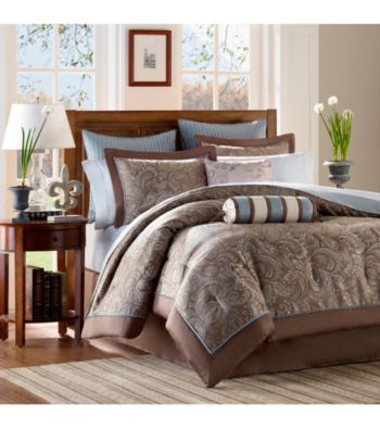 Aubrey King 12 Piece Jacquard Comforter Set on line Classically styled with a timeless paisley print, this gorgeous comforter set brings designer style to your bedroom. Cool shades of blue and warm shades of mocha mix and mingle in paisley patterns with coordinating stripes. The 12-piece set includes comforter, flat sheet, fitted sheet, 2 pillow cases, 2 pillow shams, 2 European pillow shams, 2 decorative pillows, and 1 bedskirt with a 14" drop. Queen comforter measures 90" x 92" and comes with 20" x 26" standard shams. King and California King comforters measure 106" x 92" and come with 20" x 36" king pillow shams. European shams: 26" x 26". Decorative pillows: 18" x 18" and 6.5" diameter x 18" L. Comforter and sham: 100% polyester jacquard w/ 1/2" poly charmeuse piping, 100% polyester back. Square pillow:100% polyester jacquard face /polyoni back / poly fill. Oblong pillow: polyester face / fill. Sheets: 200 tc 100% cotton. Spot clean pillows. Machine wash comforter and shams on gentle cycle in cold water. Imported.
