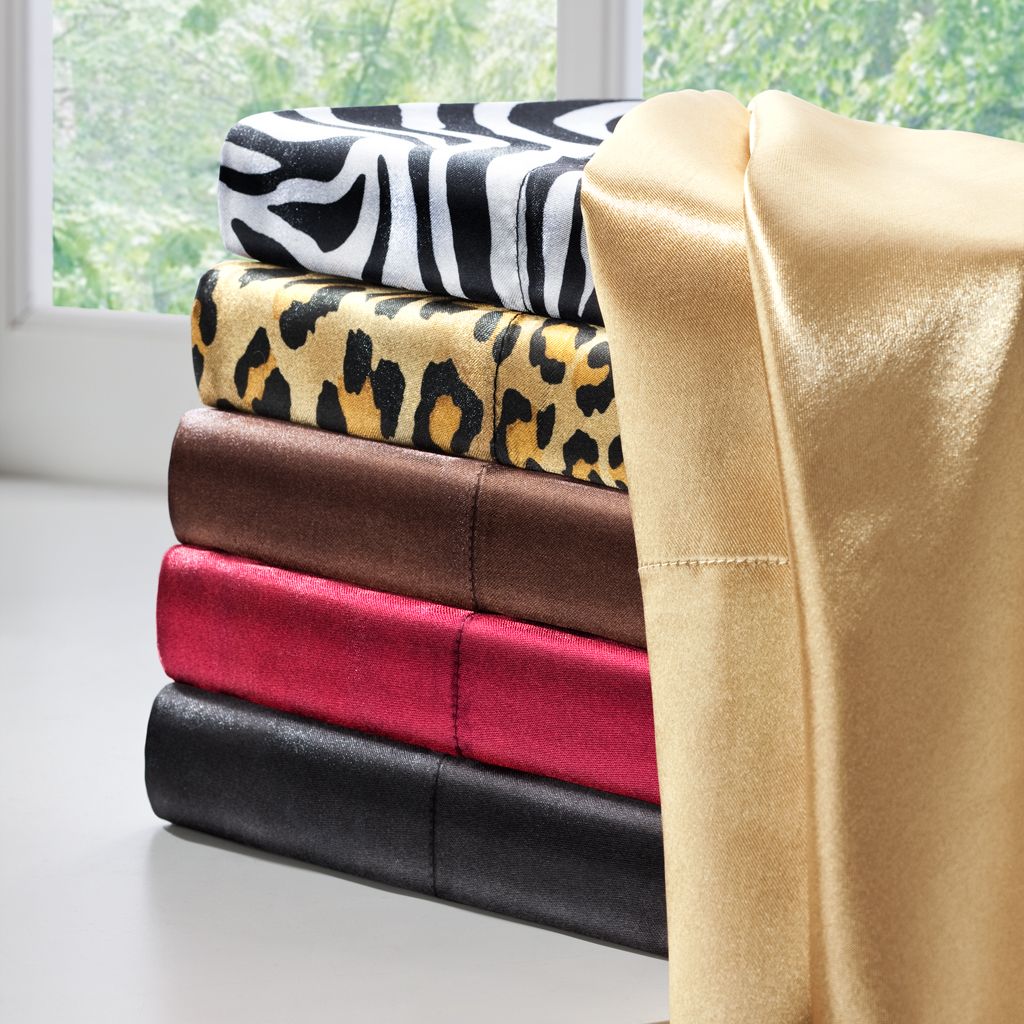 Sleep in luxurious comfort with these silky high luster satin Premier Comfort sheets. With naturally hypoallergenic properties, this sheet set has a fitted sheet pocket depth of 14 inches. Set includes: One (1) fitted sheet, one (1) flat sheet, two (2) pillowcases and two (2) bonus pillowcases Weave: Satin GSM: 90 Sheet type: Solid Pattern: Solid Fitted sheet pocket depth: 14 inches Fully elasticized fitted sheet Color options: Black, gold, red, chocolate Materials: 100-percent polyester Care instructions: Machine washable Queen Dimensions Fitted sheet: 60 inches x 80 inches Flat sheet: 90 inches x 102 inches Pillowcase: 20 inches x 30 inches The digital images we display have the most accurate color possible. However, due to differences in computer monitors, we cannot be responsible for variations in color between the actual product and your screen.